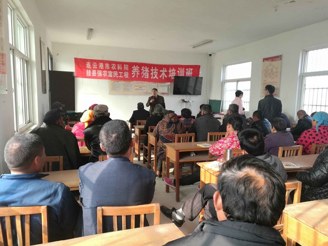 针对秋冬季节昼夜温差较大,以及东海县山左口乡养猪示范户的具体情况,11月15日连云港市农科院在山左口乡大贤庄村委会为东海县养猪示范户和带动户开展了养猪技术培训。指导养猪户加强猪舍内温度控制的同时也要改善舍内透风状况,防止呼吸道疾病的发生;要科学选择良种母猪、控制养殖成本;讲解生态养猪污染的综合防治与处理技术;指导养猪户改变观念,注重动物福利,扶正祛邪,健康养猪。结合培训内容发放了母猪繁育高产配套技术和生猪生态健康养猪技术资料100多本,培训结束后为养猪户发放了维生素、消毒剂等物化补贴并指导养猪户科学使用,得到养猪户好评。