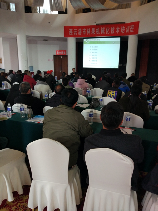11月21日,依托江苏省农科院精准扶贫项目,我院举办连云港林果机械化培训班,会议邀请扬州大学韦军教授和中国农科院郑州果树所冯义彬副研究员做技术讲座,针对我市梨、葡萄和桃树栽培技术进行指导。并向果农宣传新型果园实用机具,包括质保无人机、果园小挖机和枝条粉碎机等。
