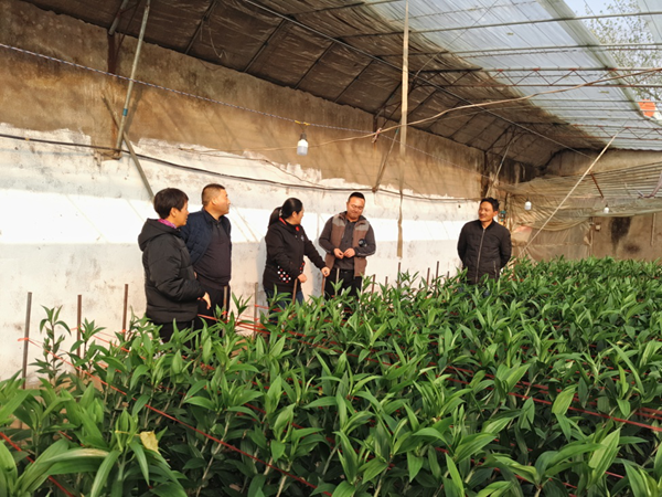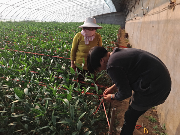 2018年11月19日,我院花卉研究中心项目组在东海县双店镇北沟村进行百合抗倒伏技术指导。专家们指出我市切花百合优良新品种‘西诺红’向光性强且根系较浅, 容易发生倒伏的特点,宜在植株长到15-20 cm及50 cm左右时分别搭建支撑网,并就如何搭建支撑网作了详细的讲解。通过搭建支撑网可以有效提高切花百合‘西诺红’的外观品质,提高花农收入。