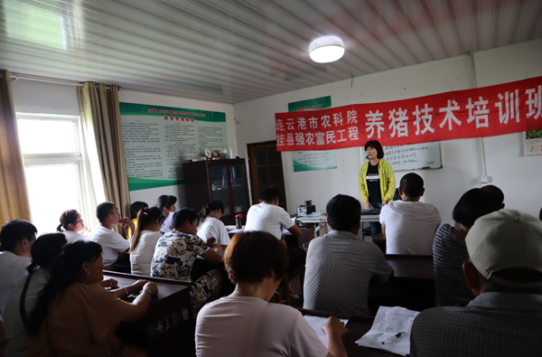 8月3日,我院生猪技术服务组在东海县白塔埠镇为白塔埠镇城后村养猪示范户和带动户开展了养猪技术培训。针对夏季高温高湿天气极易造成饲料受霉菌及其毒素污染的现象,动物中心主任柳丽开展了“霉菌毒素对养猪生产的危害及防制措施”技术培训,从霉菌毒素的产生及分类、霉菌毒素对养猪业的危害等方面做了具体的讲解,指导养猪户具体的防控霉菌毒素污染的措施以及猪霉菌毒素中毒后的治疗措施。高和坤结合当前中美贸易战对养猪业生产的影响,对现阶段养猪生产行情进行了分析,指导养猪户从事养猪生产时,注意从技术、环保、资金、文化等方面作为抓手,发展养猪大有可为。培训结束后结合技术指导内容和养猪生产需要,为培训农户发放了消毒剂、维生素等物化补贴。