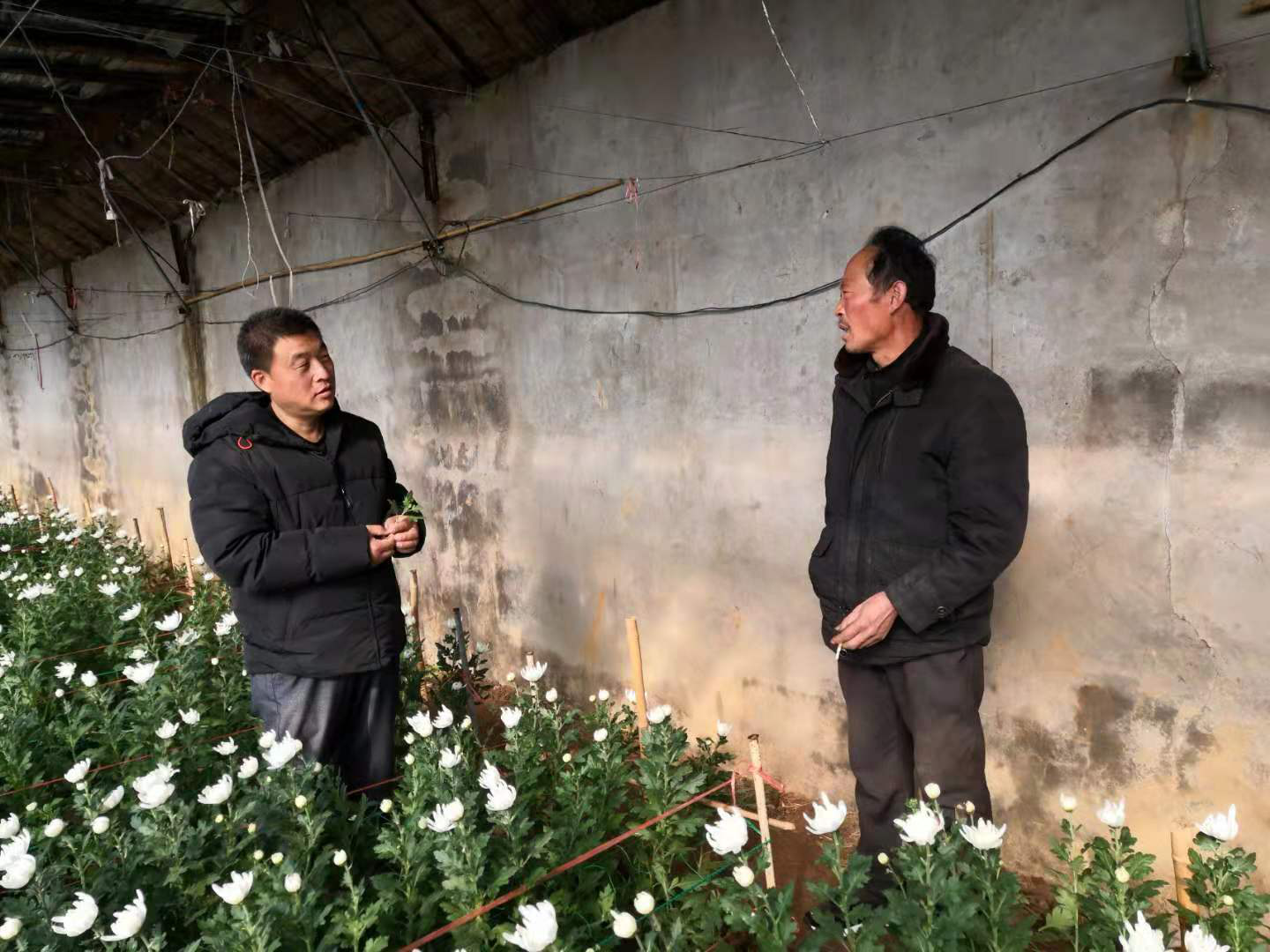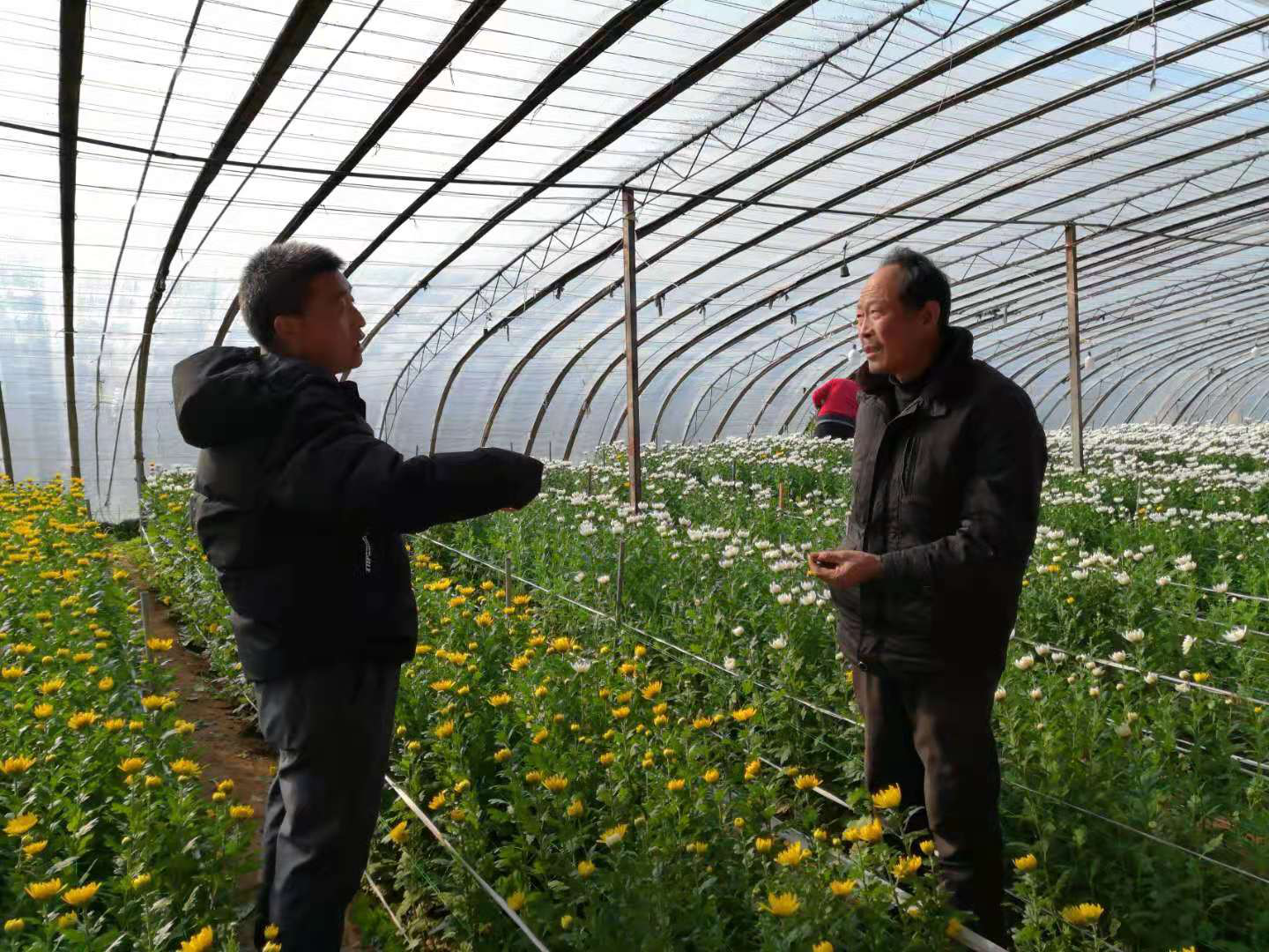 2020年12月16日,我院休闲农业研究室一行赴东海县双店镇山左口乡针对切花菊冬季栽培技术进行田间指导,邵小斌研究员就切花菊的补光、摘心、抹芽等技术的具体步骤及注意事项与种植户进行了详细介绍,并与种植户就切花菊目前常见病害“白锈病”的识别与综合防控技术进行了广泛而深入的交流。